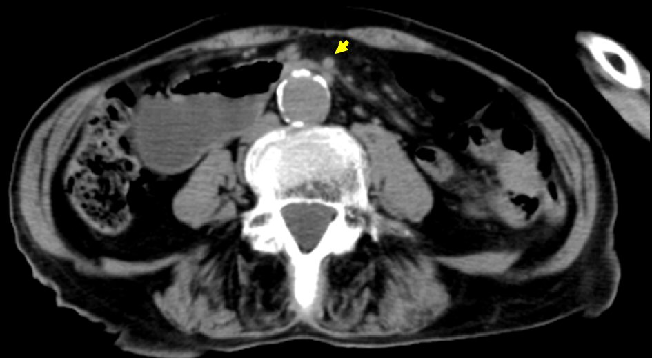 ![]() Click for large image | Figure 1. Abdominal CT revealed dilatation of the duodenum up to the level of the distal third portion, which was sandwiched between the aorta and SMA (arrow). CT: computed tomography. |