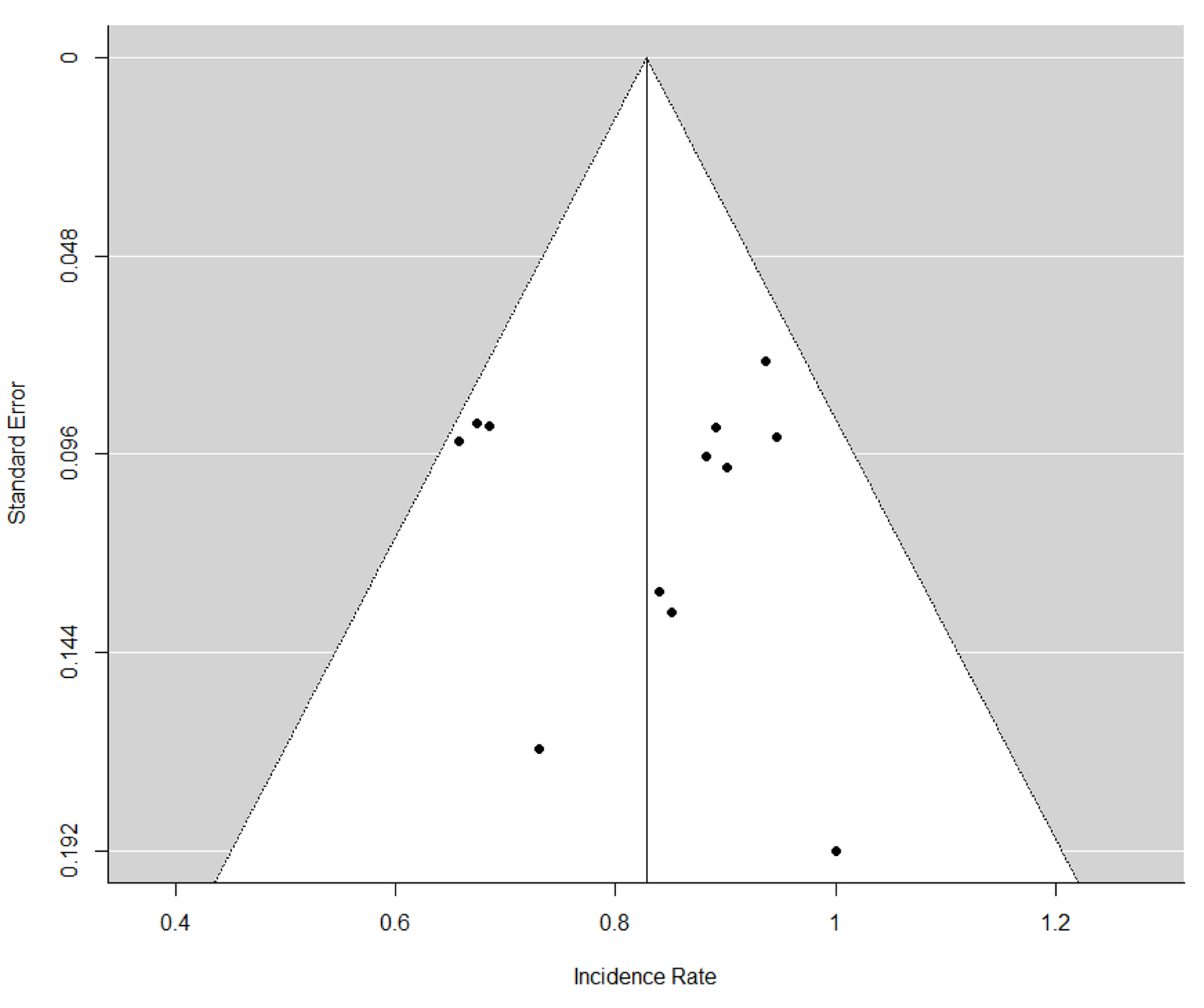 Incidence rates (IRs) and confidence intervals (CIs) were initially calculated for the primary outcome (ER) from included studies. The pooled IR is considered statistically significant if 95% CI did not contain 1. Forest plots were then made using pooled estimates and measure of variability of each included study. Publication bias was evaluated by funnel plot diagram. Variability between included studies was assessed by heterogeneity tests using I2 statistic. All analyses were conducted using RStudio (Version 1.0.136; Boston, MA) using the “Meta” and “Metafor” package.