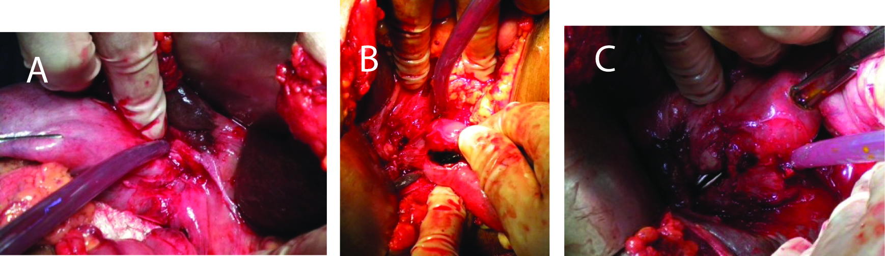 The patient had exploratory laparotomy with peroperative findings revealing gallbladder placed vertically with short cystic duct with neck abutting hydatid cyst of liver with thickened walls. Atretic hydatid liver cyst containing infected bile with ruptured membranes. A small fistula measuring 1 cm was seen between liver hydatid cyst and right hepatic duct. Another fistula measuring 0.5 cm was found with the gallbladder (Fig. 2 A-C). Suture repair of fistula was done with evacuation of ruptured membranes from liver hydatid. Ruptured membranes with stent inside were seen after choledochotomy. Evacuation of cyst contents from liver cyst and CBD was done with choledochoduodenostomy. Cholecsytectomy was done with gallbladder containing ruptured membranes and cystic duct being patent. Histopathology of gallbladder revealed features of acalculous cholecystitis. She was discharged with Albendazole therapy. Follow-up was uneventful.