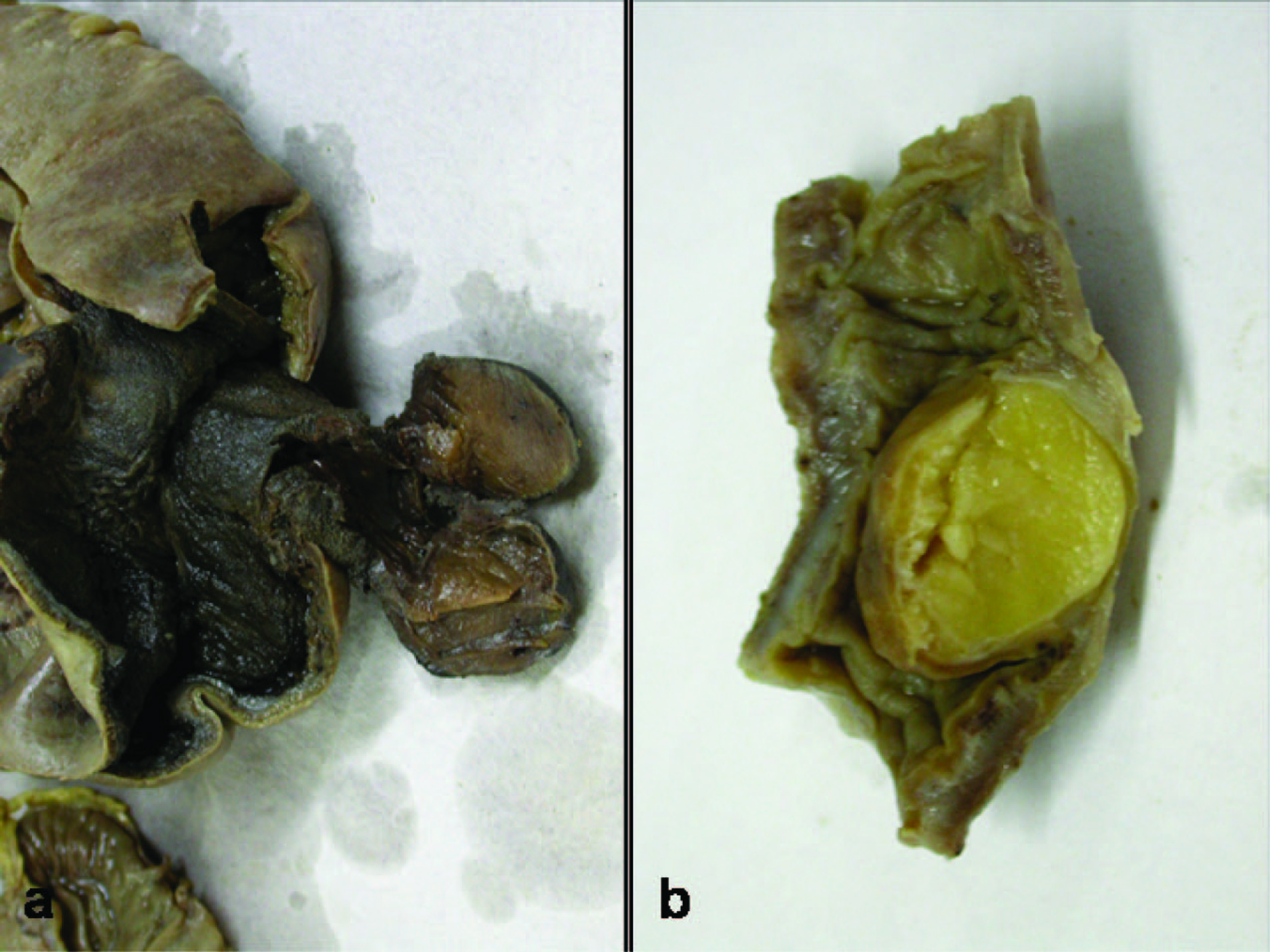 ![]() Click for large image | Figure 1. (a) Gangrene intestine with sesile Lipomatous polyp; (b) Submucosal Lipomatous polyp. |