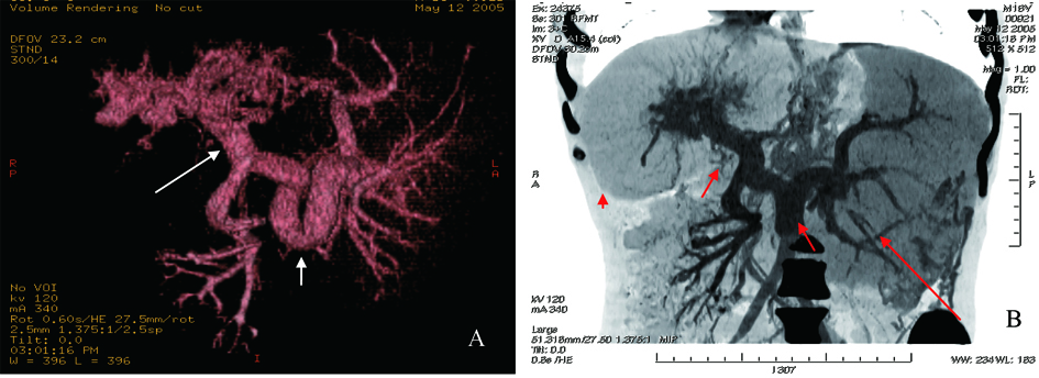 An 18-year-old male patient was admitted to the Department of Hepatogastroenterology, the first affiliated hospital of Dalian Medical University (Dalian city, Liaoning Province, China) because of intermittent hematemesis and melena for 12 days. He had no history of alcohol abuse and hepatitis. And no record of hereditary liver disease was found in his family members. Physical examination showed abdominal wall varices, enlarged liver and spleen. Routine lab biochemistry showed normal levels of aspartate aminotransferase, alanine aminotransferase, albumin, total bilirubin, γ-glutamyltransferase, but elevated concentration of serum creatinine (Cr, 224 µmol/L) and blood urea nitrogen (BUN, 10.04 mmol/L). Laboratory tests failed to show any positive Hepatitis B surface antigen or anti-hepatitis C virus antibody. Blood sample test showed decreased amounts of white blood cells (WBC, 1.54 x 109/L), red blood cells (RBC, 3.0 x 1012/L), hemoglobin(Hb, 8.80 g/dL) and platelets (PLT, 32 x 109/L),which indicated the existence of hypersplenism. Immunology test showed normal levels of serum ferrum and ceruloplasmin. Autoimmune antibodies associated with liver disease, such as anti-nuclear antibody, smooth muscle antibody, liver-kidney cytoplasm antibody etc, are all negative. K-F ring was not found with split lamp. Upper barium X-ray exam revealed esophageal varices. Abdominal enhanced CT scans showed hepatosplenomegaly, thickening spleen vein and portal vein, dilated intra-hepatic bile ducts and medullary sponge kidney (Fig. 1A, B). CT angiography revealed dilated circuitous portal and spleen vein, unobstructed hepatic vein and inferior vena cava (Fig. 2A, B). We also undertook liver biopsy, and the noodle-cutting fresh liver tissue was fixed in formaldehyde solution, embedded in paraffin. Sections of 4 µm in thickness were prepared and stained with hematoxylin and eosin. Microscopically, the section sample showed swelling hepatocytes, grossly hyperplasia of fibrous connective tissues in the portal area, bile ductules hyperplasia and intra-hepatic bile duct ectasia, without inflammatory infiltration and sedimentation of amyloid, ferrum and copper (Fig. 3A, B, C, D).