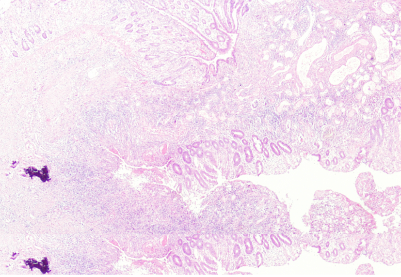 ![]() Click for large image | Figure 4. Microscopic findings of resected specimen showed the formation of fistula associated with colonic inflammation reaction. |