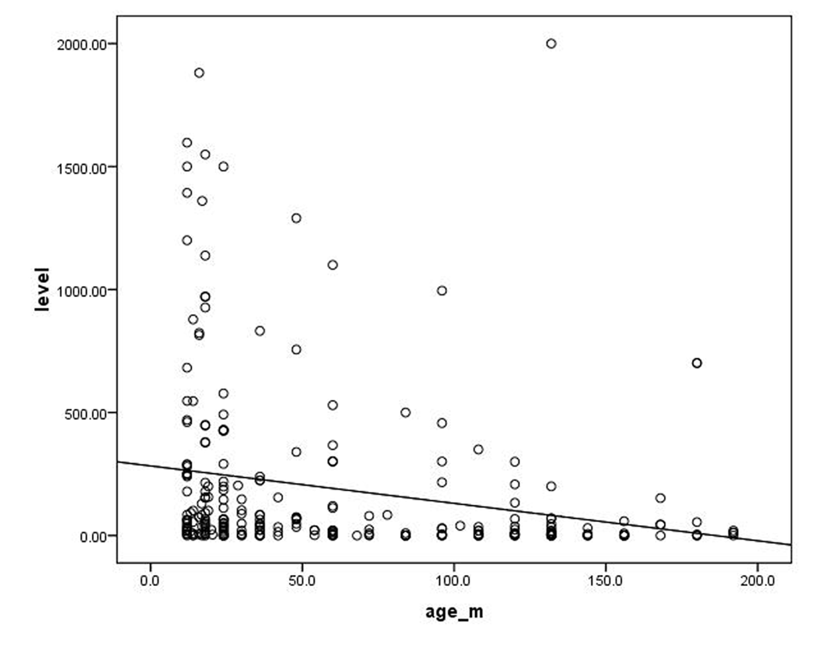 ![]() Click for large image | Figure 1. Correlation between age (in months) of the participating children and their Ab titer (r = -0.2; P = 0.0001). |