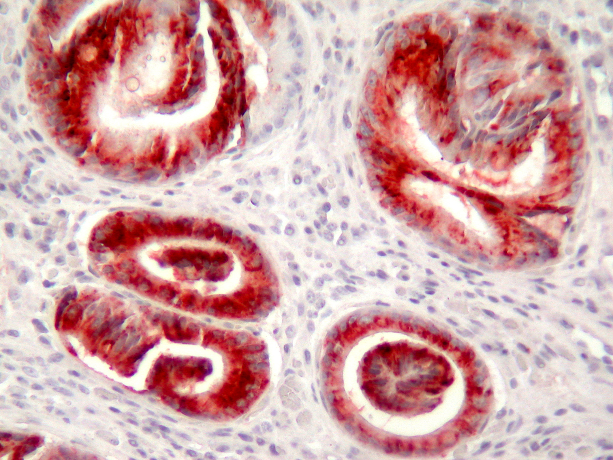 ![]() Click for large image | Figure 4. MUC5AC expression commonly in the distorted glands (immunohistochemistry MUC5AC X200). |